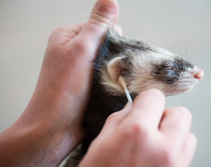 Knijp natuurlijk niet te hard, maar zorg er wel voor dat het fretje niet kan ontsnappen. Eerst gaan we wat oorreiniger in het oortje druppelen en van onder naar boven de gehoorgang masseren.